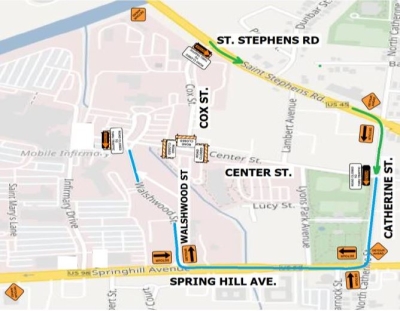 Mobile, AL – Center St. is currently closed between Walshwood St. and Catherine St. for road repairs. The assigned detour route will be Catherine St. to Spring Hill Ave. to Walshwood St. Cox St. is closed to through traffic between St. Stephens Rd. and Center St. Both roads (and the intersection) are planned to be reopened no later than Saturday, February 3rd.