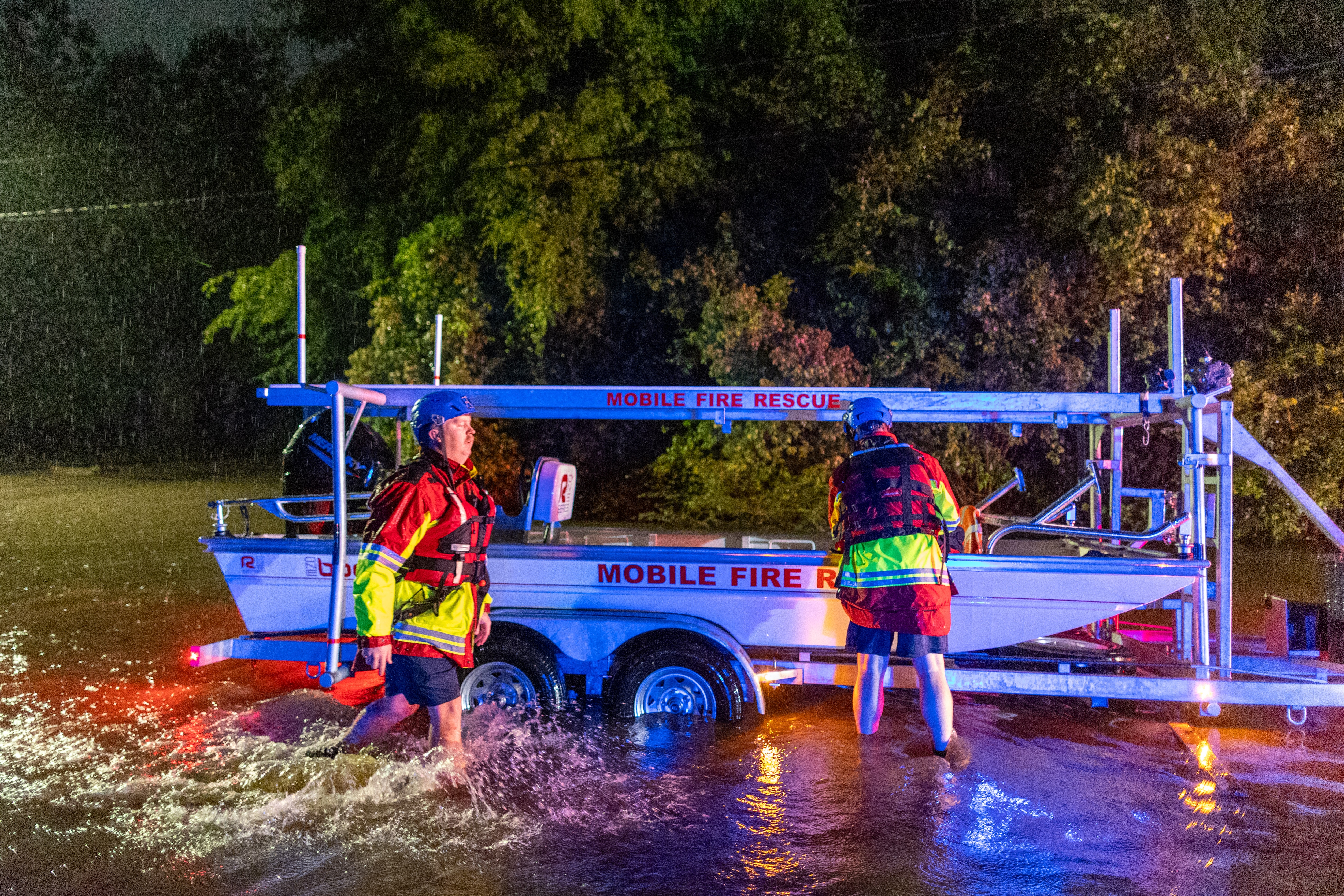 Mobile Fire-Rescue Department firefighters and technical rescue personnel were dispatched at about 10:16 p.m. for a report of a water rescue in the 5100 block of Halls Mill Road in Mobile, Alabama, Sunday night, April 6, 2025, after dispatchers received a call from someone stuck in a partially submerged vehicle.