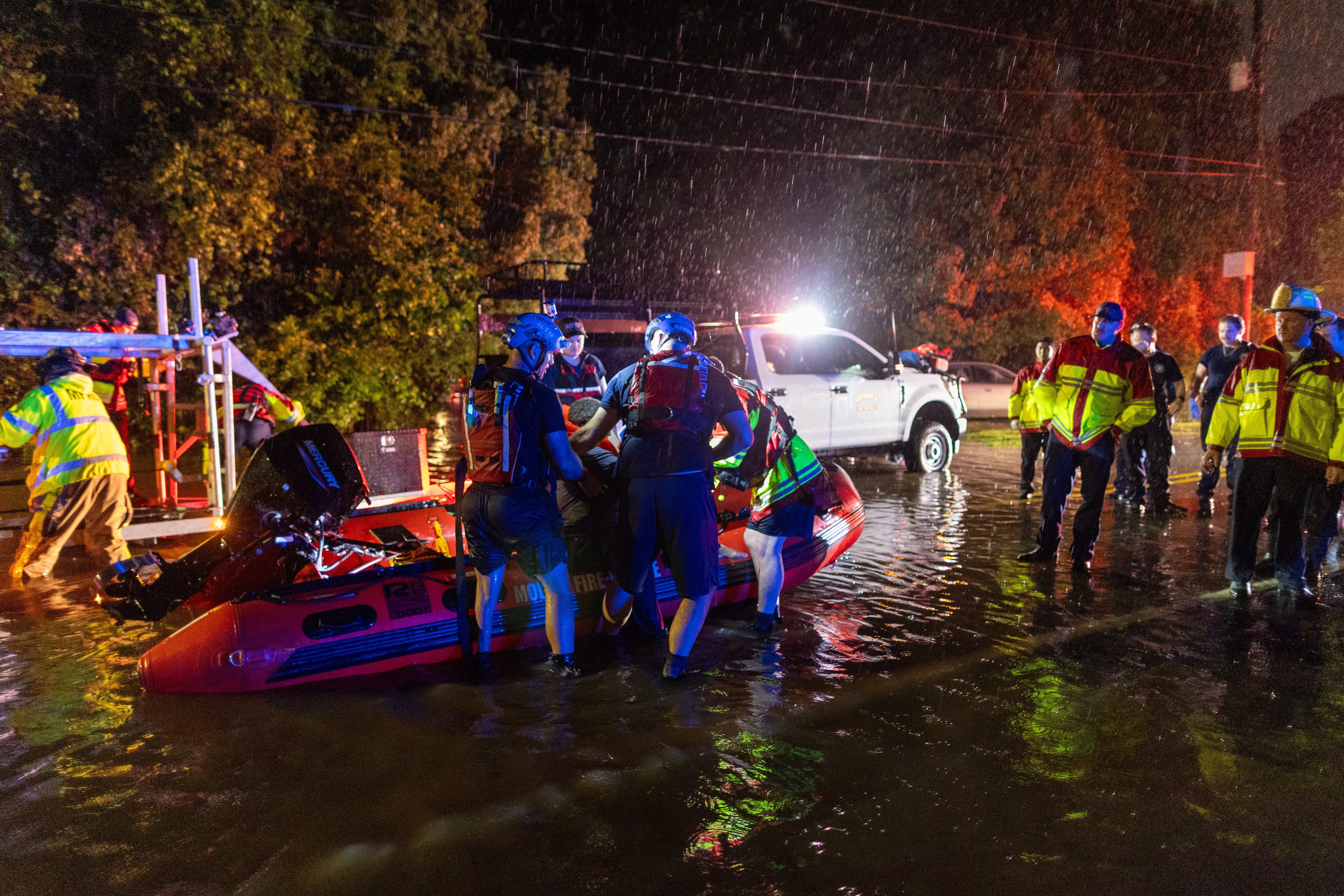 At 11 p.m., the rescue boat returned to the edge of floodwaters on Halls Mill Road, where firefighters helped her to safety and walked her out of the boat. She was treated on scene and transported by MFRD paramedics to a local hospital for evaluation.