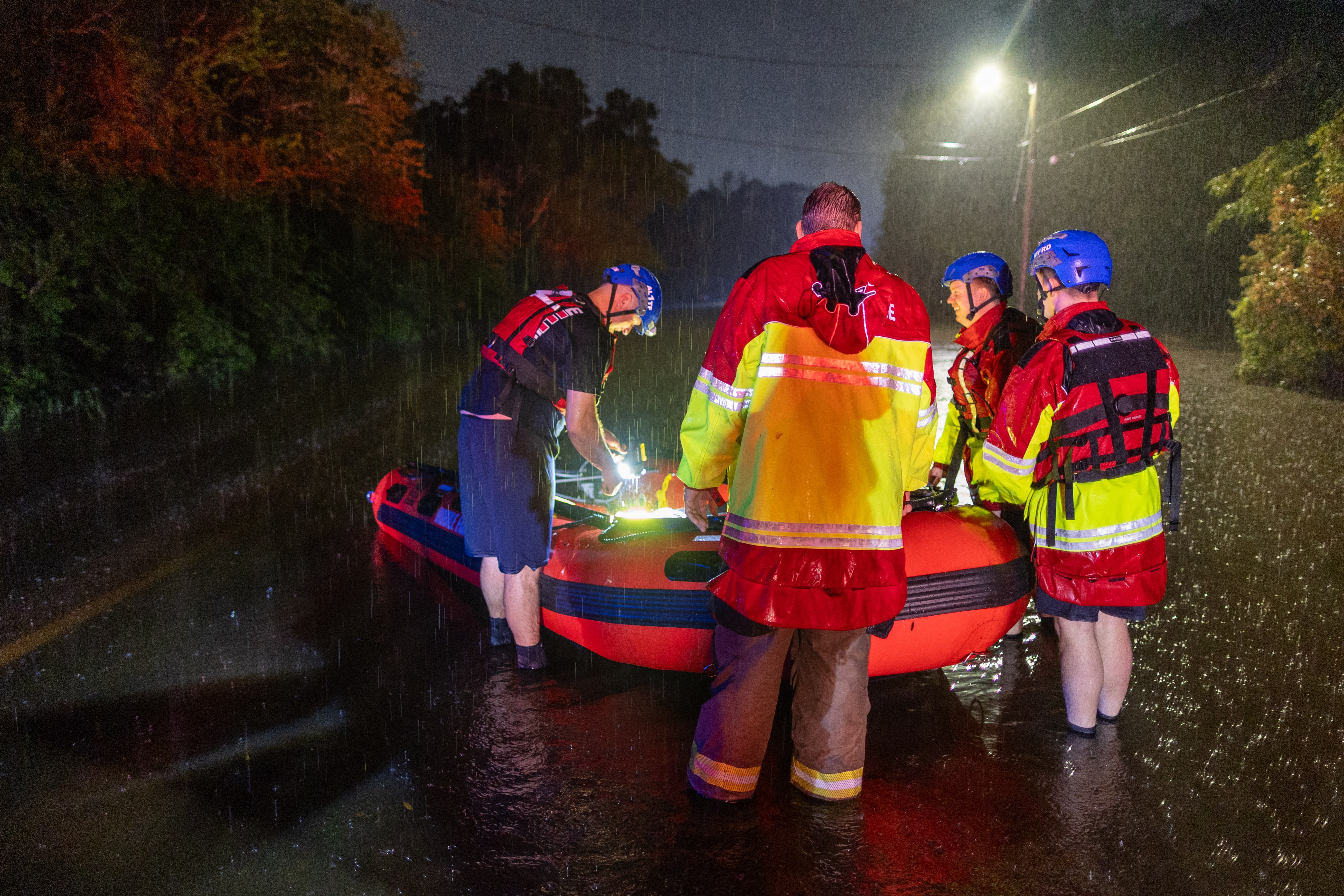 Units arrived on scene and launched a team of rescue technicians in an inflatable boat to reach the victim. The boat set out with gear and swift water swimmers into the darkened floodwaters. A second boat with backup gear and more rescuers was prepared and launched.