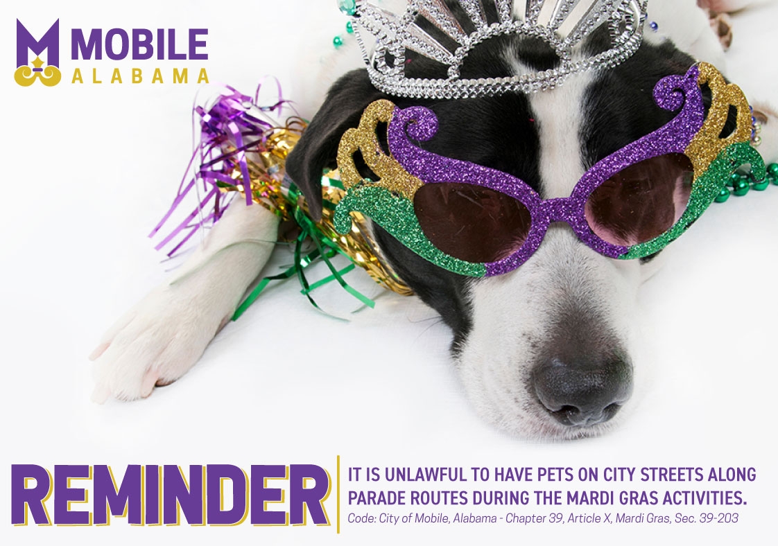 We are so excited for Mardi Gras season, and we know you are too! All pets look cute in their purple and gold, but please remember to keep them at home. Having pets on city streets along the parade routes during Mardi Gras activities is unlawful. Thank you for helping us keep your pets safe!