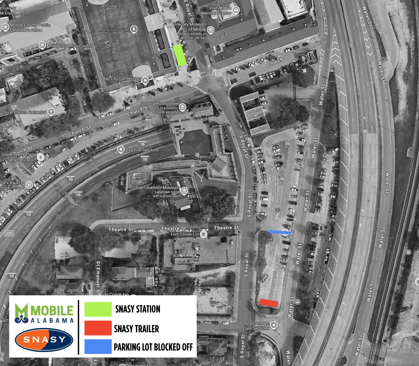 MPD's temporary impound lot will be located under the I-10 overpass on Water Street near the Canal Street intersection. The temporary impound facility will close at 10 p.m. on each parade day. When the temporary impound facility closes at 10 p.m., towed vehicles will be moved to the MPD Impound Lot located at 1251B Virginia St, Mobile, AL. Cars towed on February 16 and 17 will NOT be moved after 10 a.m. and will be left at the temporary impound facility overnight. The temporary impound yard is fenced, gated and locked with a padlock.