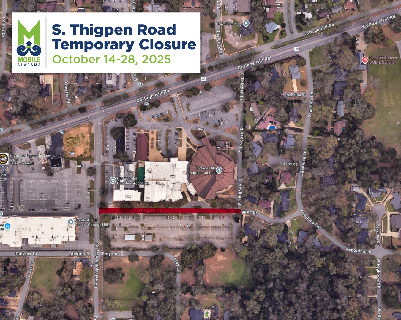 The closure will be in effect for approximately two weeks and will end on Tuesday, October 28. Drivers will still be able to access Cottage Hill Baptist Church and Cottage Hill Christian Academy.